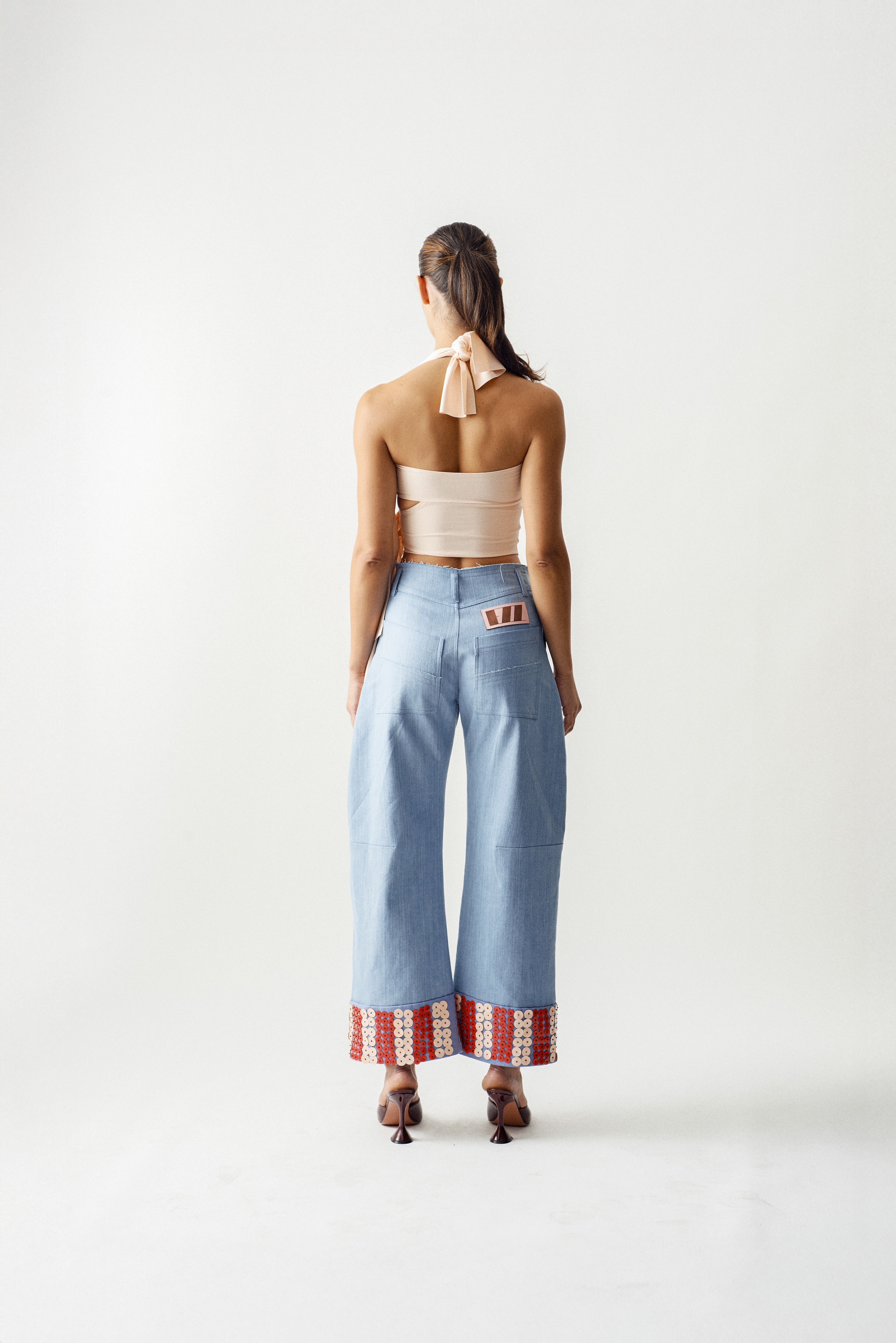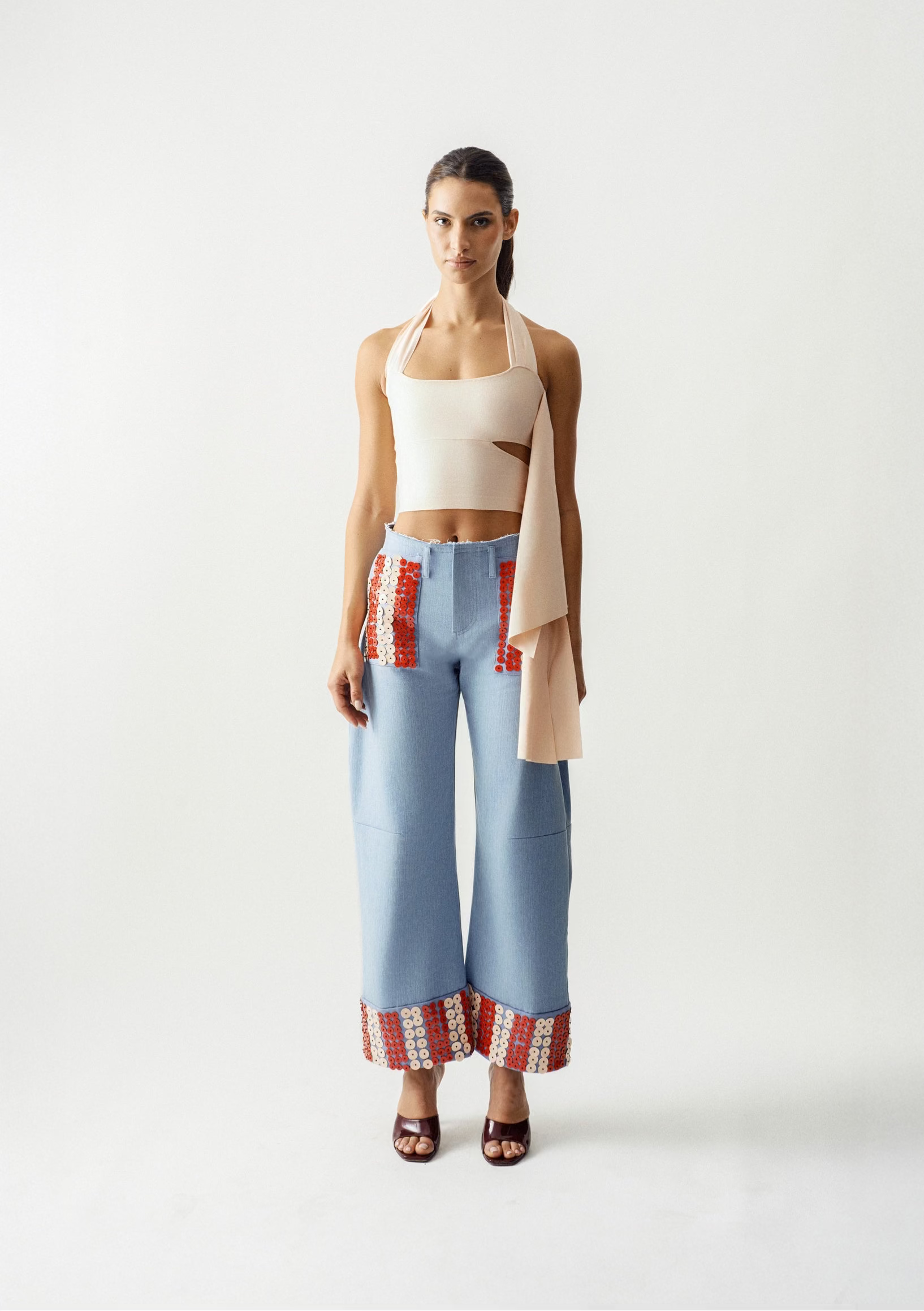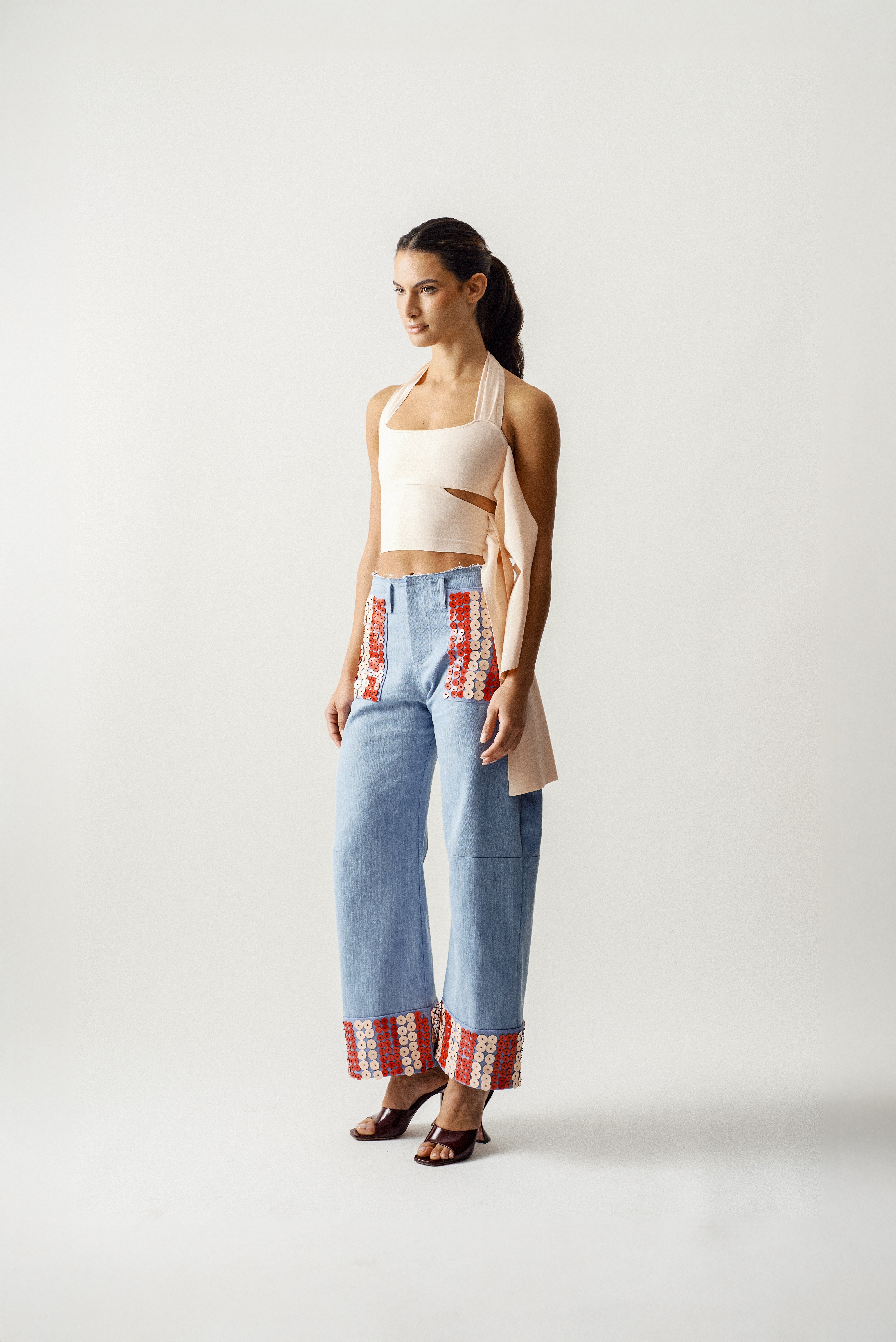 High-waisted barrel-cut jeans featuring sequin panels along the pockets and hem. Made from structured cotton fabric.