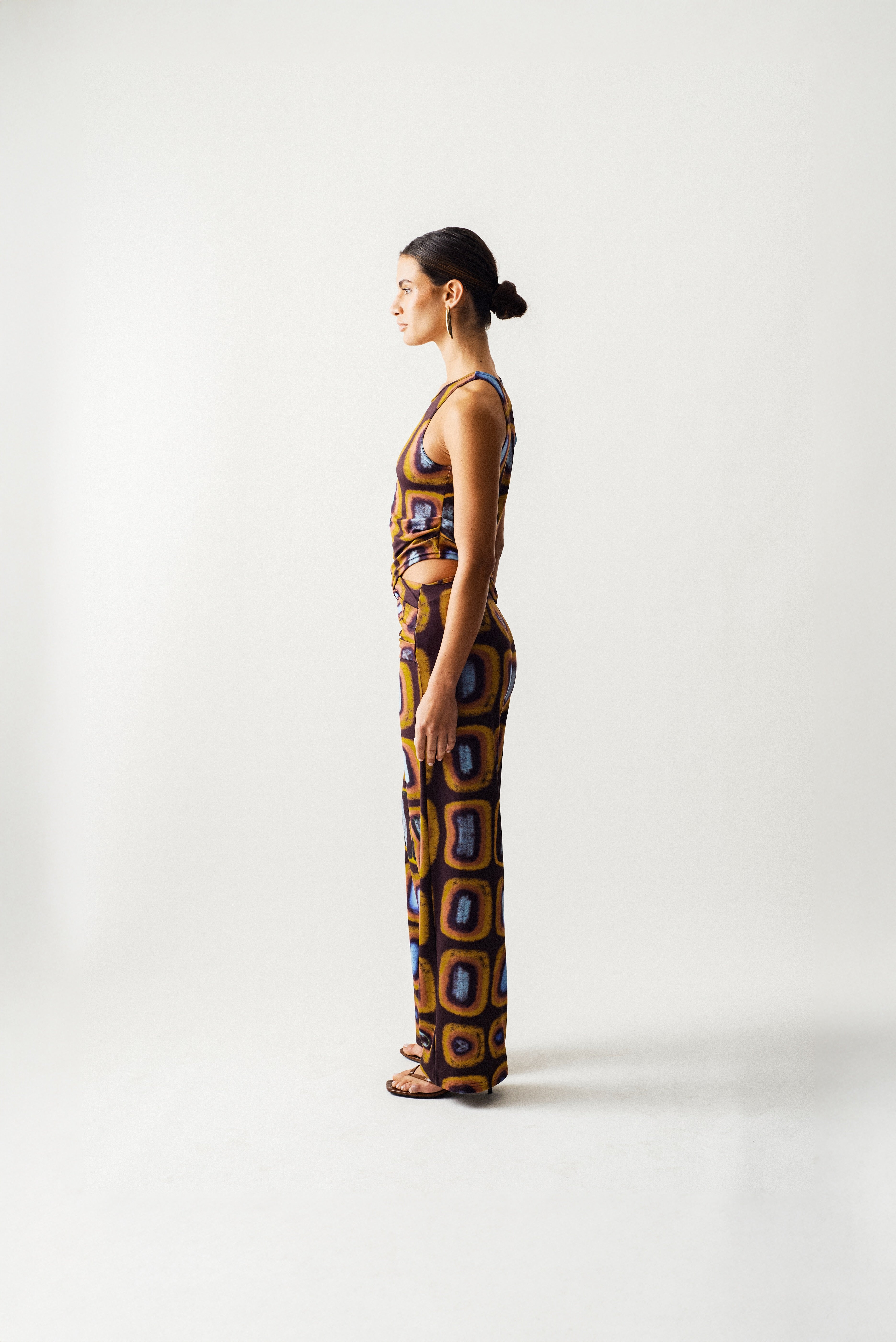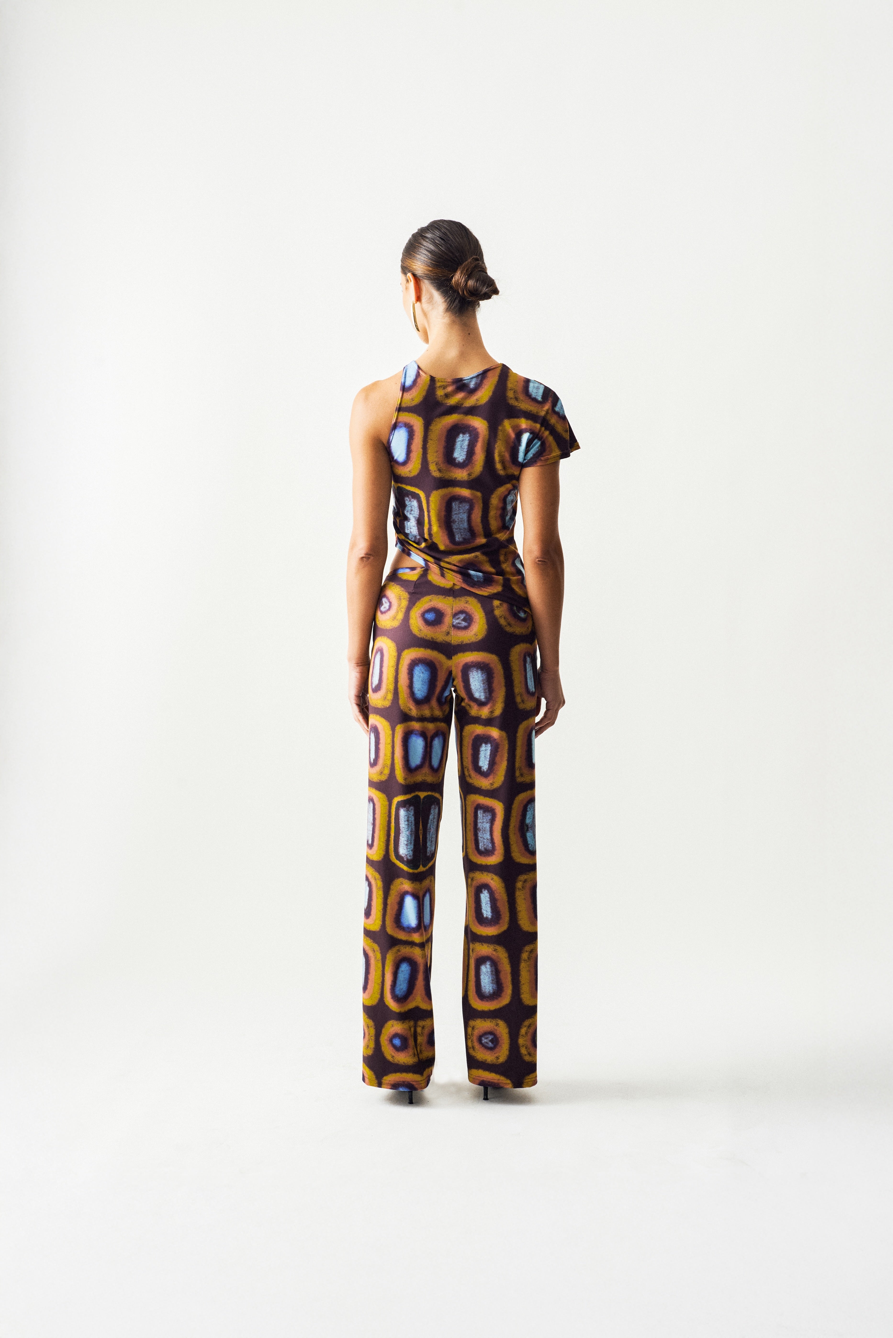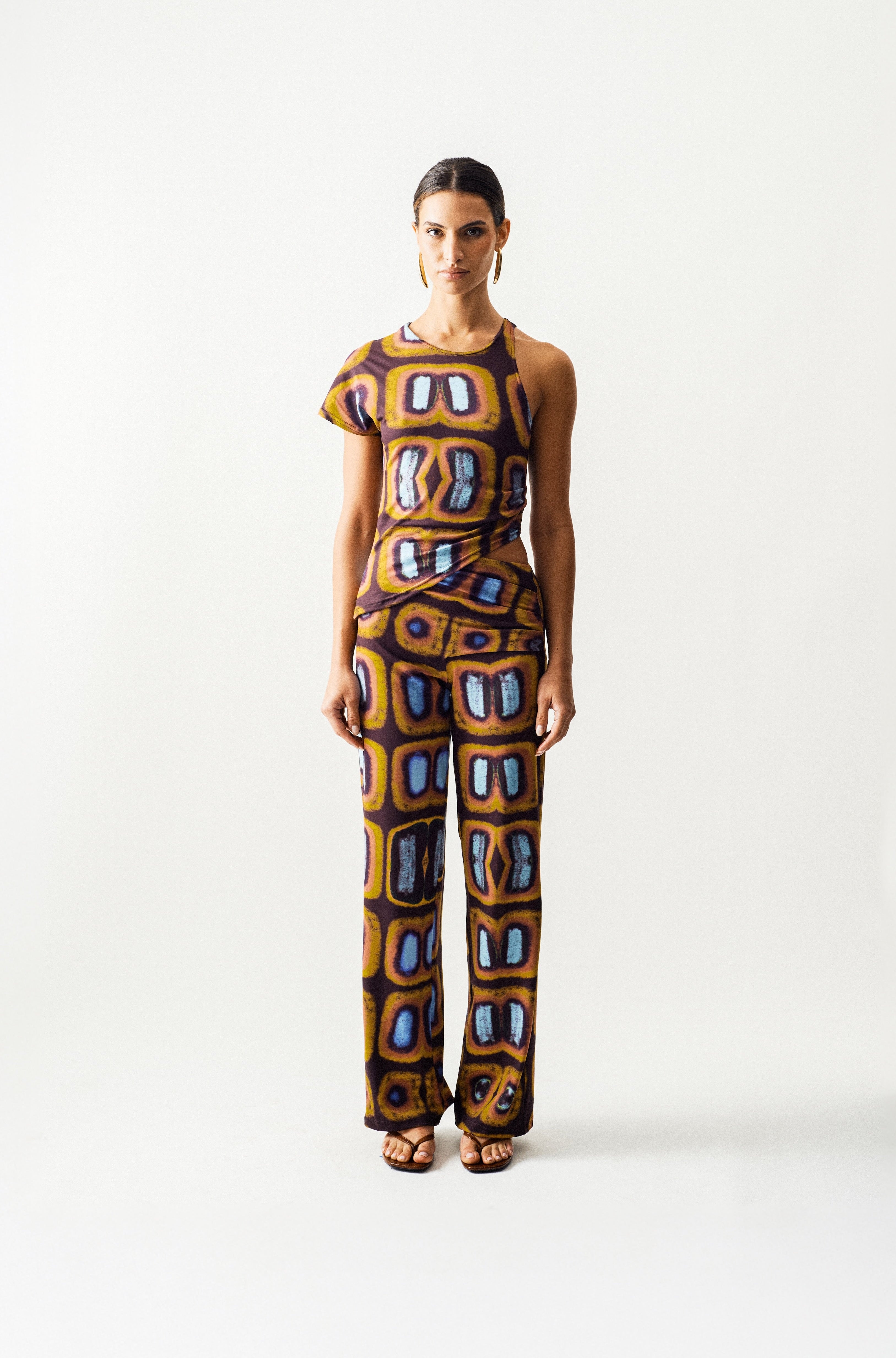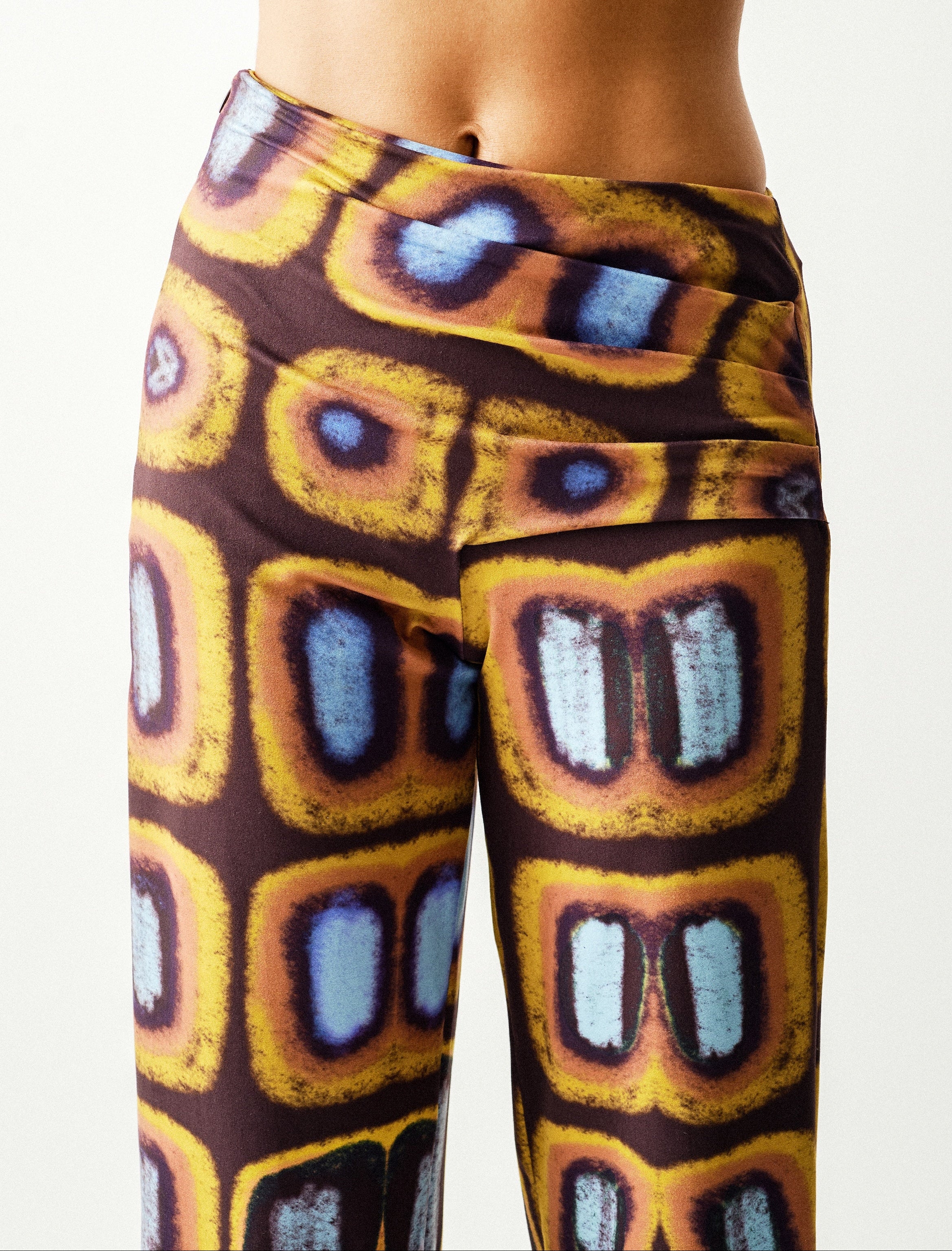 Asymmetric waistband pants with pleats for a loose and comfortable fit. Printed on recycled stretch fabric.