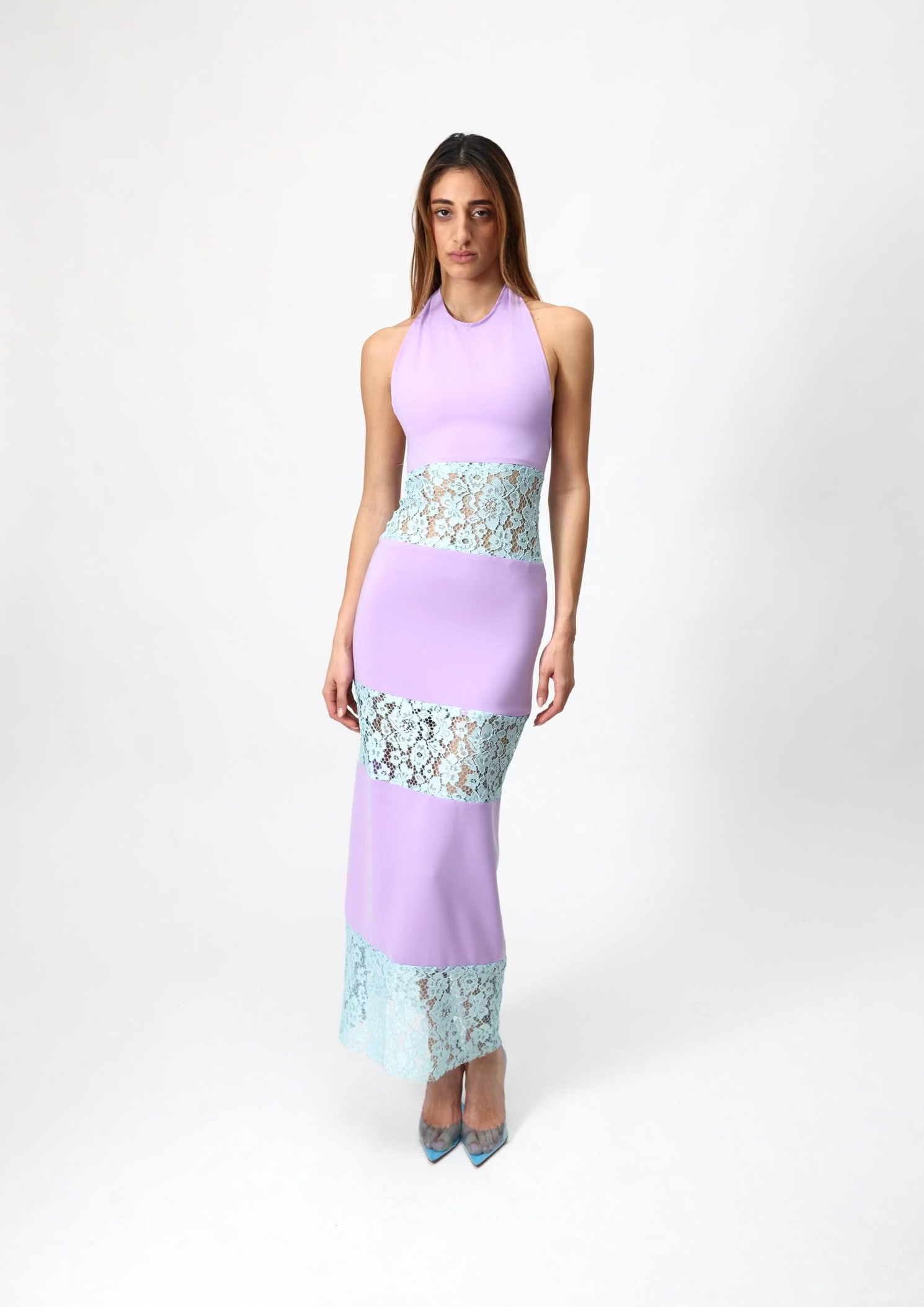 A pastel lila halter gown elevated by exquisite aqua lace panels, offering a refined silhouette.