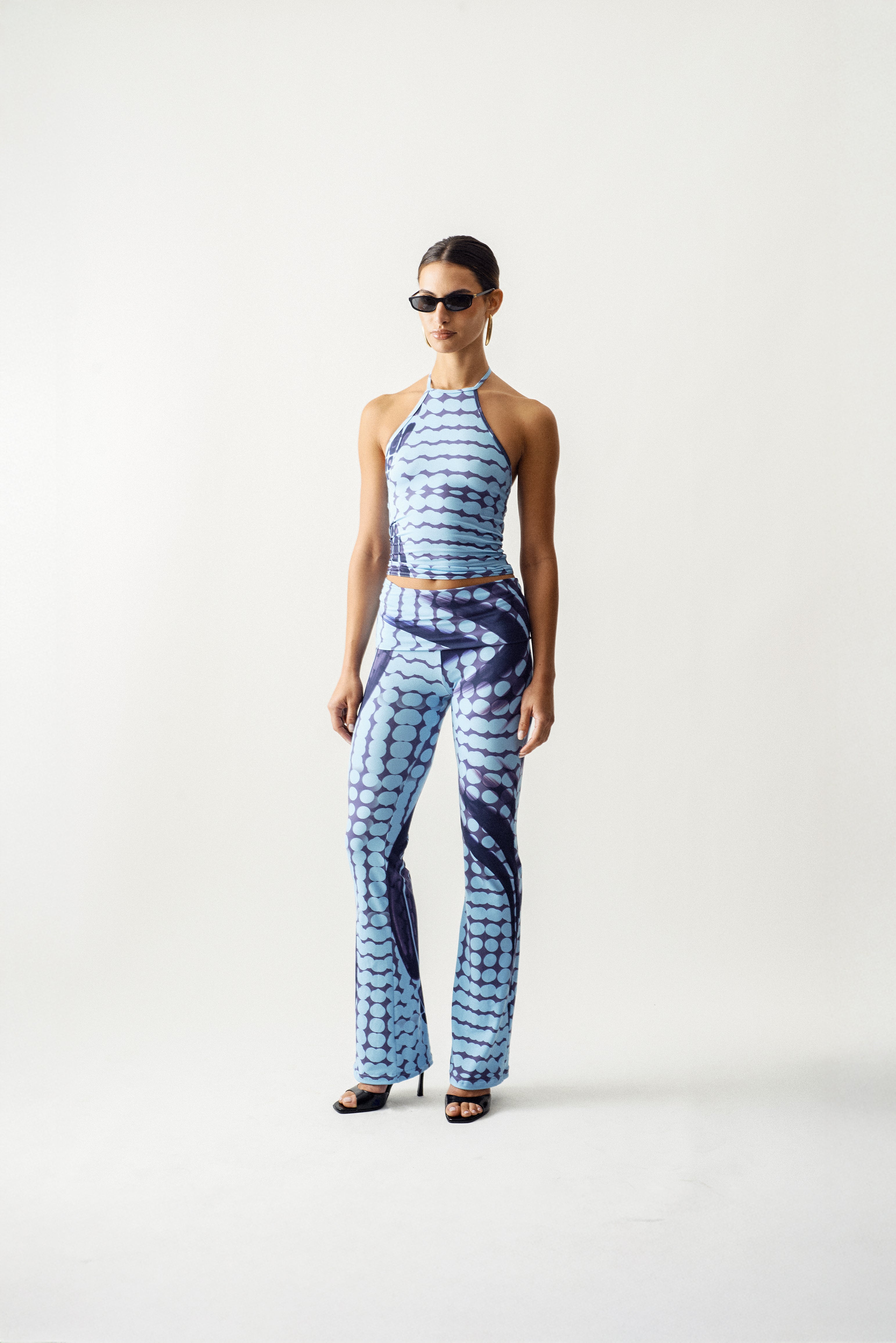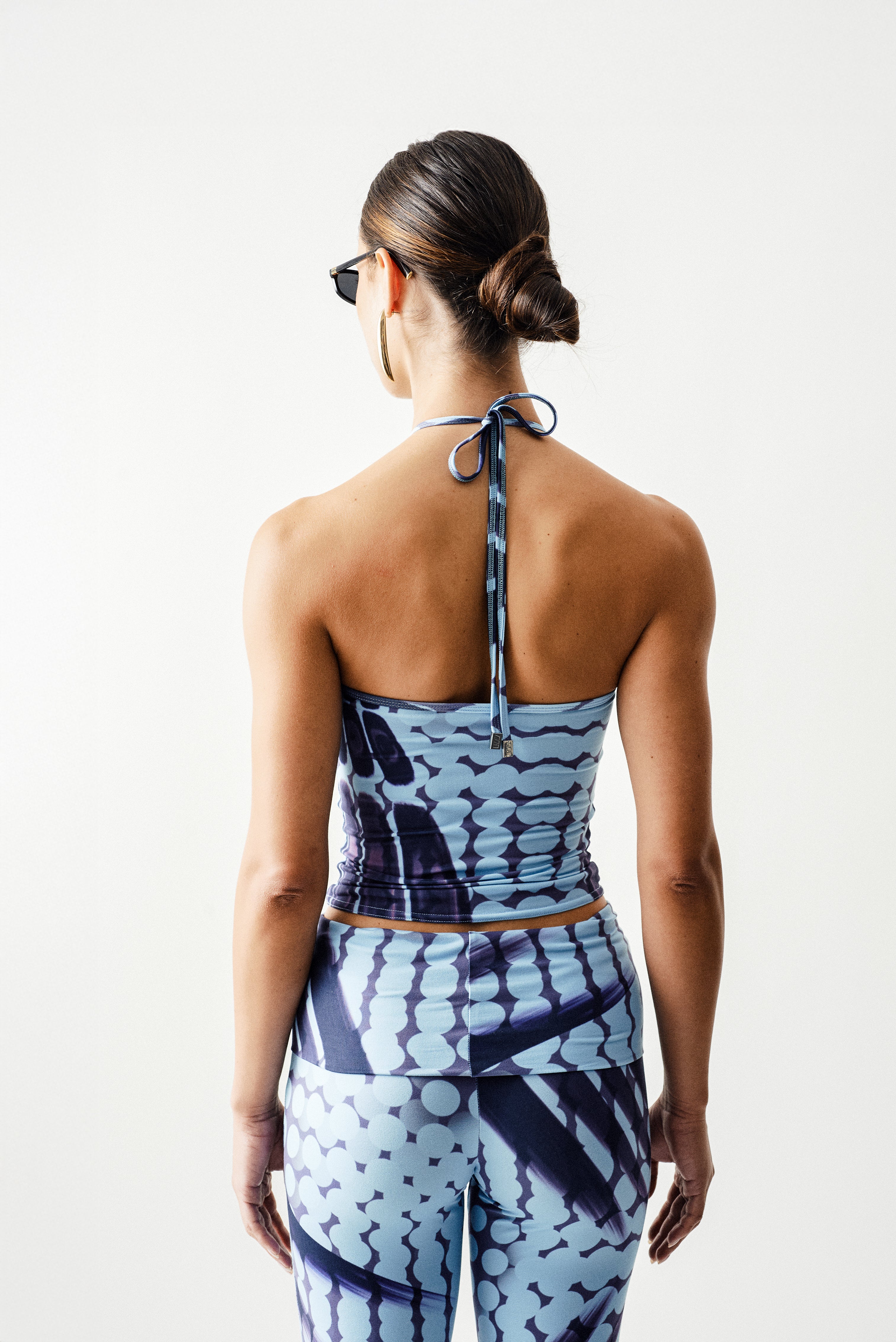 Halter top with open back and slim fit. Made from recycled peach cotton fabric with printed pattern.