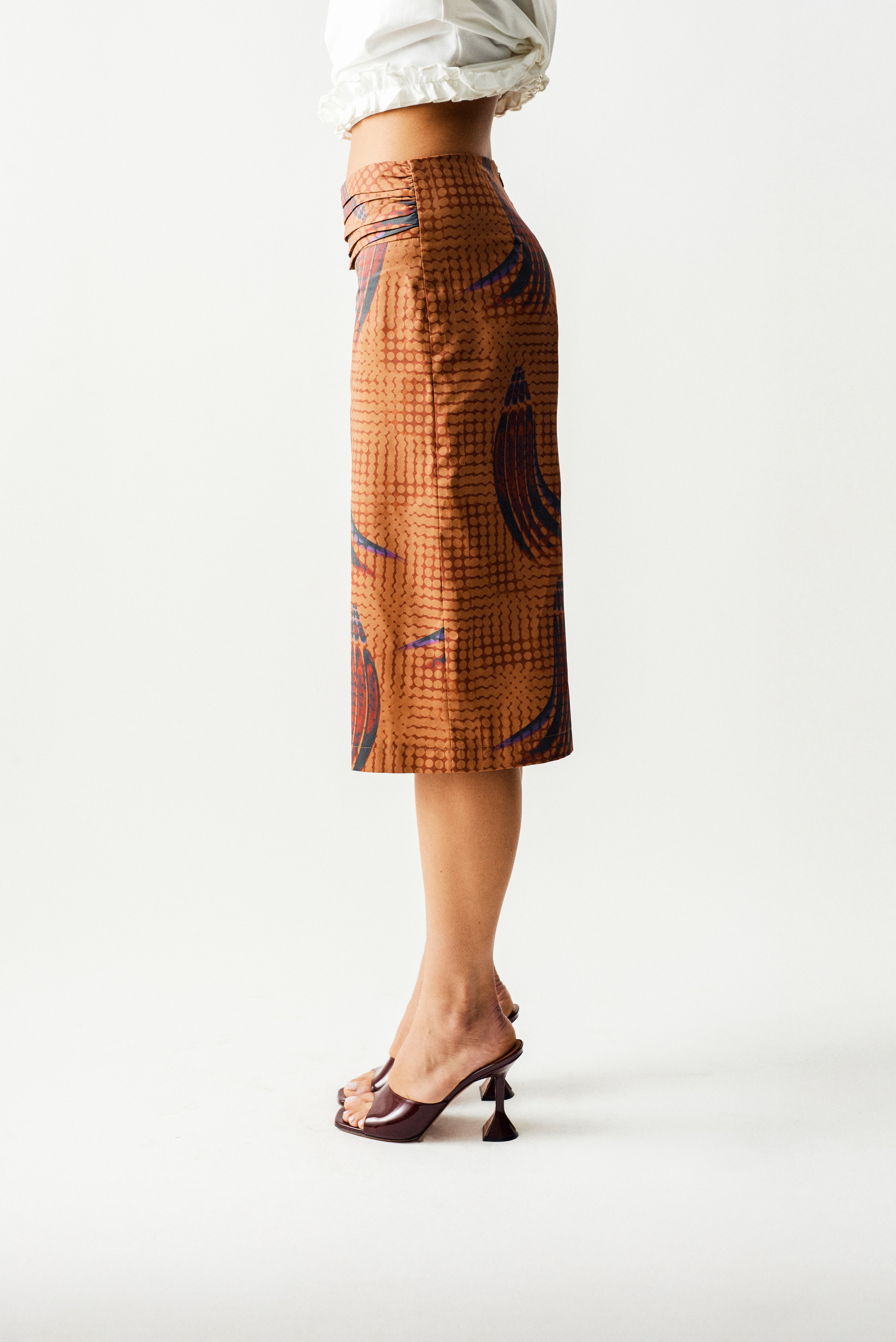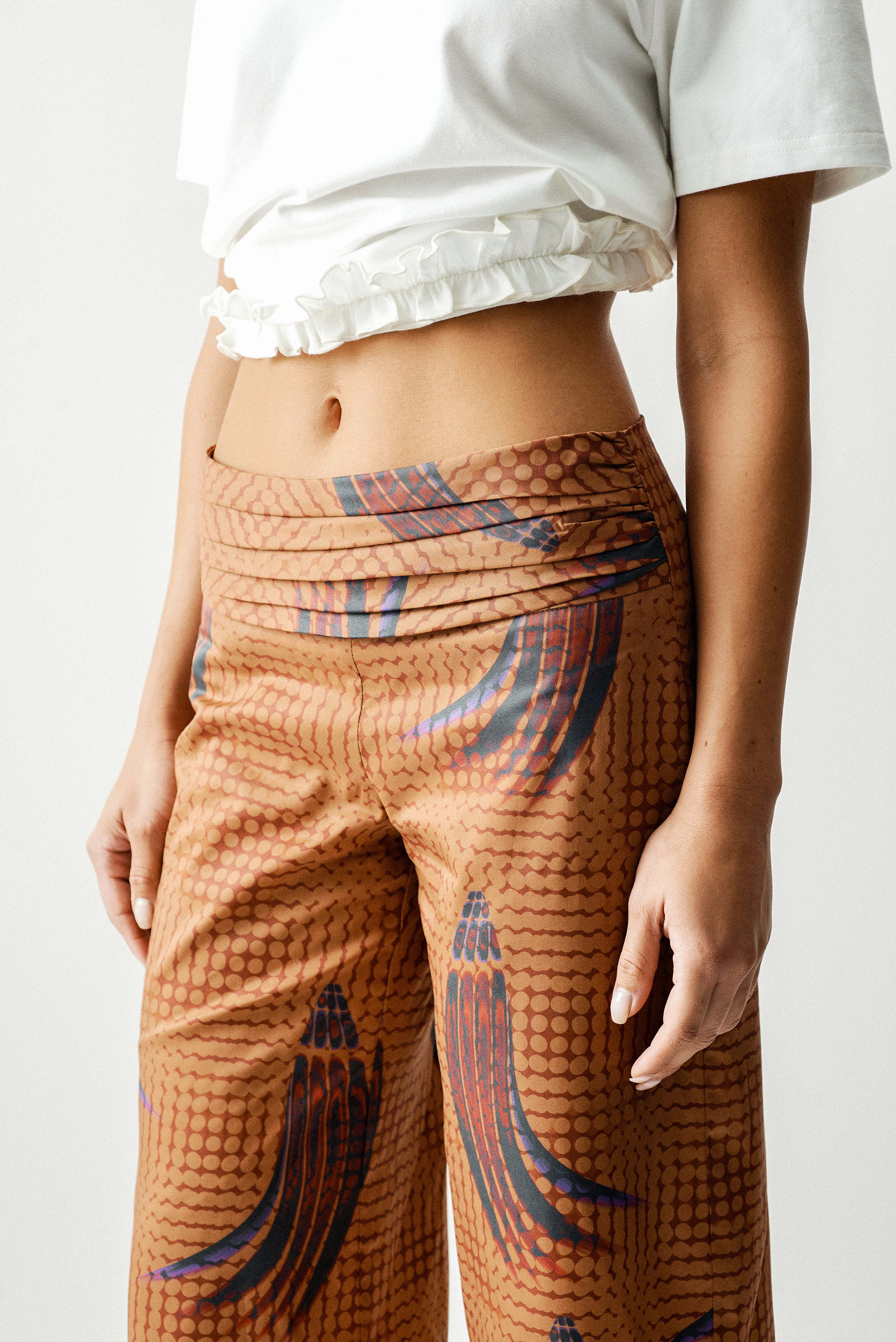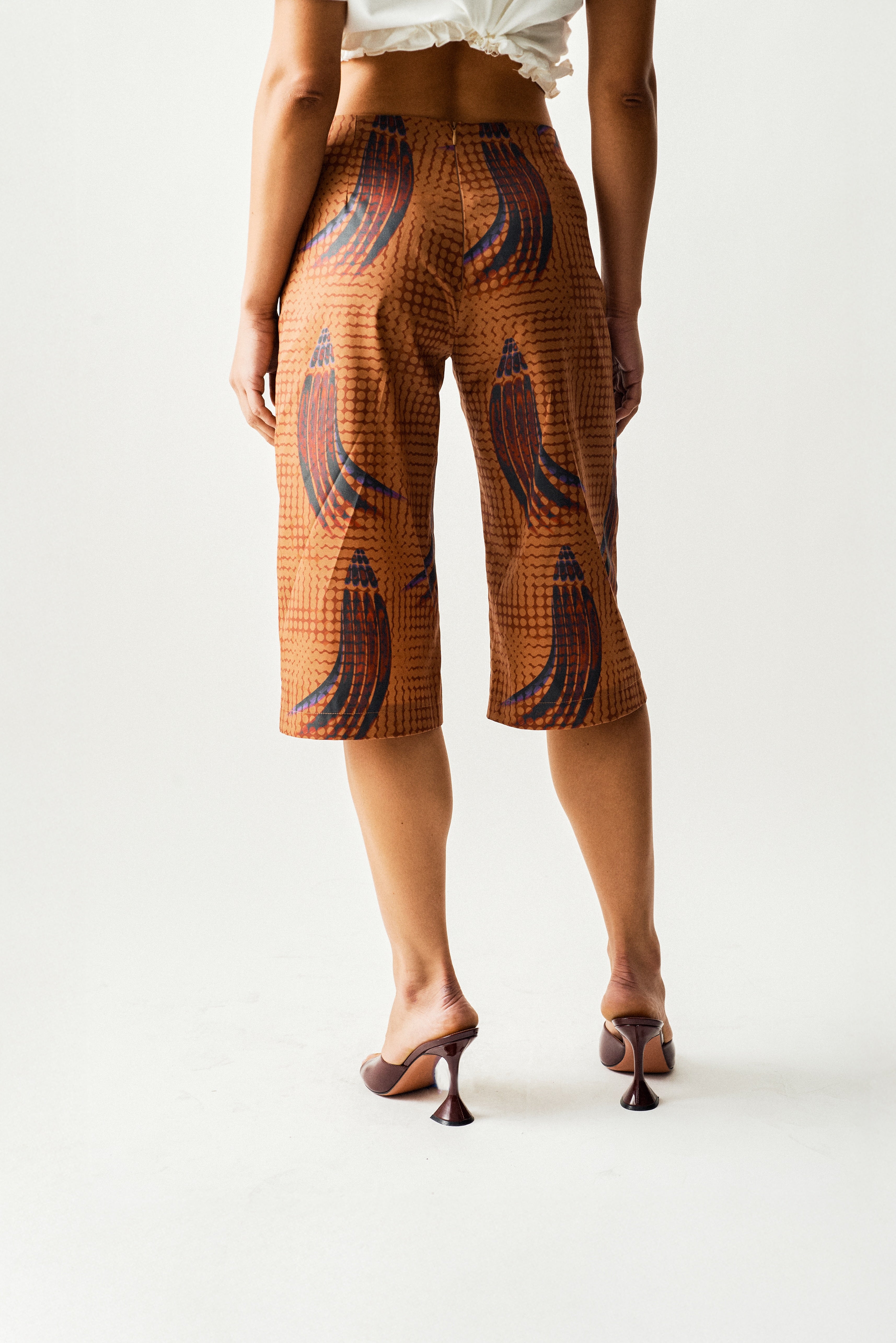 Low-Waisted Bermuda shorts with a pleated waistband for a modern silhouette. Made from recycled printed cotton fabric.