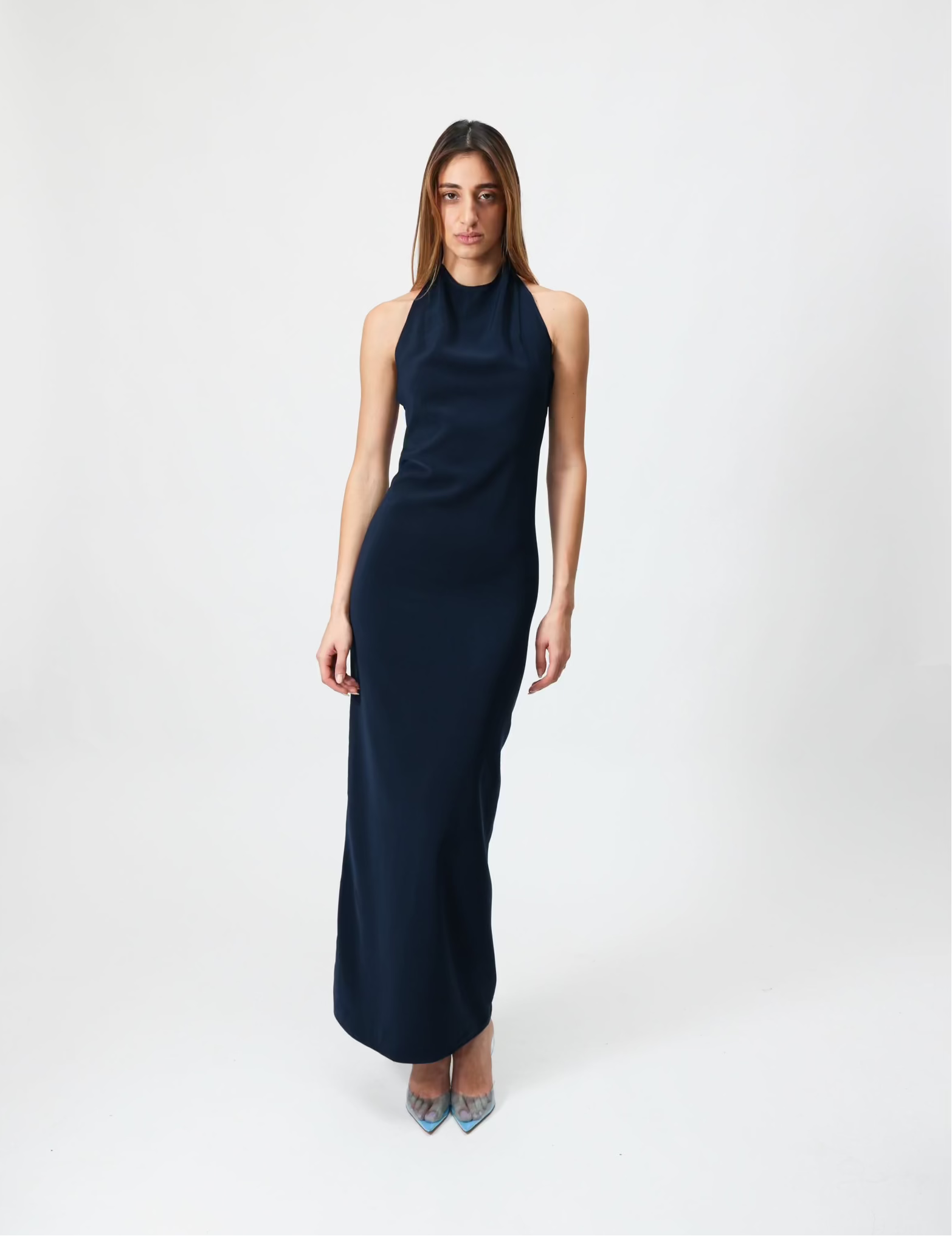 A sleek navy halter gown defined by a refined silhouette and an alluring open back adorned with a delicate pearl chain.